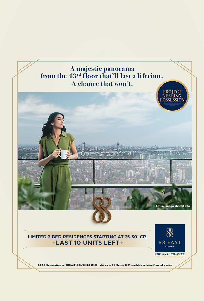 A stunning tribute to the city's most affluent, 88 East welcomes you to your signature abode in the sky. The perfect, refined blend of the city's unfettered flair for indulgence and exquisite lifestyle awaits you at this 43-storey residential statement. Then there's an overwhelming list of luxuries that have been tailored to bring a smile upon your face at every moment. It's the life you truly deserve. And it comes with your own place amidst Kolkata's most iconic skyline.